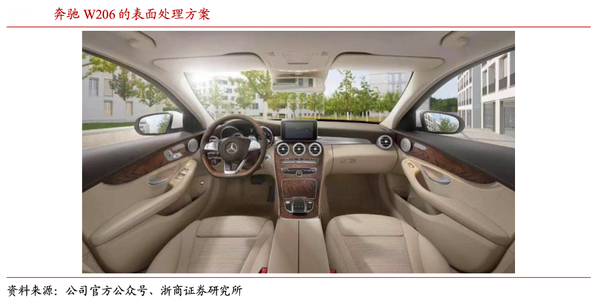 經(jīng)典案例:根據(jù)公司官方公眾號、浙商證券研究所等綜合資訊表明,均勝群英與德系品牌有較長合作歷史,為其車型提供飾件。如 2021 年戴姆勒奔馳公司全球推出的車型 W206 就搭載了均勝群英最新的真木&金屬混合材料制成的表面處理方案。