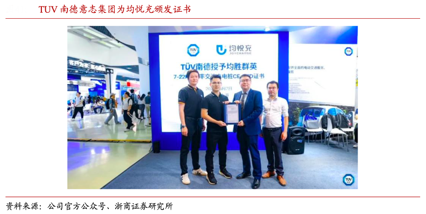經(jīng)典案例:根據(jù)公司官方公眾號、浙商證券研究所等綜合資訊表明,均悅充旗下的充電 樁、隨車充等產(chǎn)品系列獲得了 CQC 認(rèn)證,提升產(chǎn)品的市場整體競爭能力。此外,均悅充旗 下“均悅·享”智能交流樁、隨車充等多產(chǎn)品在 2022 年獲得歐標(biāo)認(rèn)證,為進(jìn)軍歐洲市場提供基礎(chǔ)。2023 年 6 月 7 日,均悅充旗下 7-22kW 功率交流充電樁(歐標(biāo))獲得了 TUV 南德意志集團(tuán)頒發(fā)的“TUV 南德安全認(rèn)證”及“CE-RED”證書,再一次證明了公司的研發(fā)實(shí)力,彰顯產(chǎn)品核心競爭力。