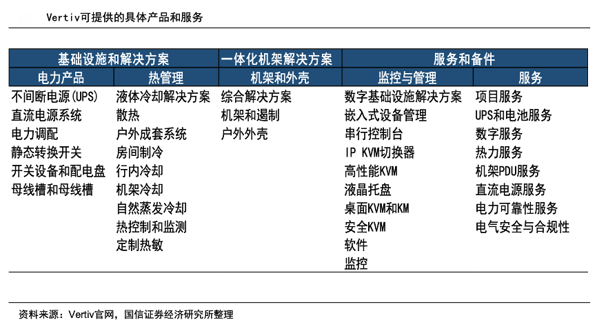 經(jīng)典案例:根據(jù)Vertiv官網(wǎng)、國(guó)信證券經(jīng)濟(jì)研究所等綜合資訊表明,Vertiv公司業(yè)務(wù)圍繞電力、冷卻和IT管理展開,下游主要涉及數(shù)據(jù)中心、通信網(wǎng)絡(luò)以及商業(yè)和工業(yè)環(huán)境三大領(lǐng)域。公司主要提供從云到網(wǎng)絡(luò)邊緣的電力、冷卻和IT基礎(chǔ)設(shè)施解決方案和服務(wù),具體產(chǎn)品包括基礎(chǔ)設(shè)施和解決方案(交流和直流電源管理、熱管理、低/中壓開關(guān)設(shè)備、母 線槽和集成模塊化解決方案)等。