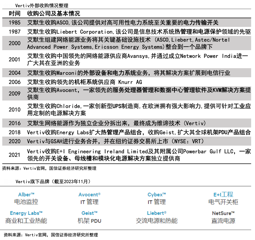 經(jīng)典案例:根據(jù)Vertiv官網(wǎng)、國信證券經(jīng)濟研究所等綜合資訊表明,Vertiv通過多次外部 收購,目前Vertiv旗下有8家子品牌,分別是Alber、 Avocent、Cybex、E+I、Energy Labs、Geist、Liebert以 及NetSure,擁有電力、冷卻到IT服務的一系列全方位品牌組合,在全球擁有200多個服務中心和3,500多名服務工程師。