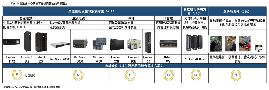 經(jīng)典案例:根據(jù)Vertiv官方材料、國信證券經(jīng)濟研究所等綜合資訊表明,在數(shù)據(jù)中心領域,Vertiv產(chǎn)品覆蓋了從電力系統(tǒng)、冷卻到服務等眾多環(huán)節(jié)。完整的產(chǎn)品組合意味著公司可以滿足客戶多樣化的數(shù)據(jù)中心部署 方案需求,競爭對手分散,而Vertiv是唯一能提供全套解決方案的廠商,其產(chǎn)品組合完備+產(chǎn)品實力領先推動公司保持第一。