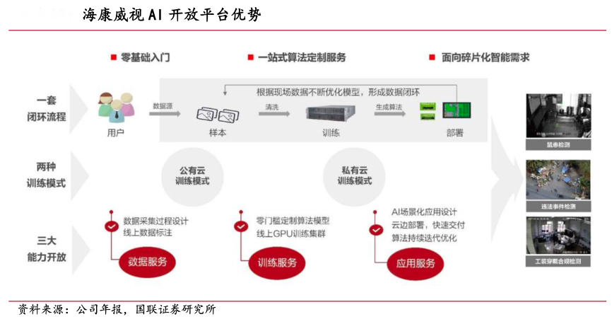 經(jīng)典案例:根據(jù)公司年報、國聯(lián)證券研究所等綜合資訊表明,??低?nbsp;AI 開放平臺自上線以來,吸引了來自教育、醫(yī)療、金融、零售、制造、交通等多個行業(yè)的用戶和合作伙伴,為各行業(yè)的智能化升級提供了強(qiáng)有力的支撐。截 至 2023 年 6 月 30 日,海康威視 AI 開放平臺服務(wù)的中小微企業(yè)已經(jīng)超過 2 萬家,生成模型超過 8 萬個,落地項目超過 1.4 萬個,企業(yè)成交用戶數(shù)超過了 1 萬家。