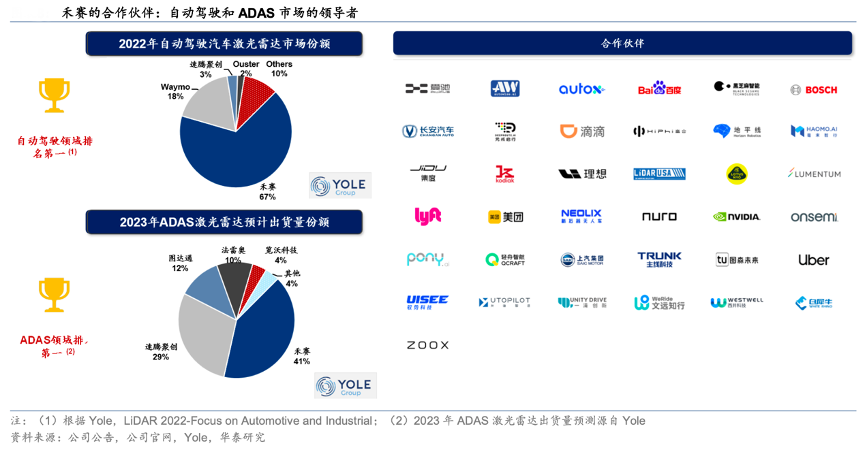 經(jīng)典案例:根據(jù)公司公告、公司官網(wǎng)、YoLe、華泰研究等綜合資訊表明,在過(guò)去數(shù)年中,禾賽與汽車、自動(dòng)駕駛和機(jī)器人應(yīng)用龍頭建立了緊密的合作伙伴關(guān)系。在汽車領(lǐng)域,禾賽與博世、理想、長(zhǎng)安、高合以及路特斯等多家行業(yè)領(lǐng)先的整車廠和科 技公司建立了一系列合作伙伴關(guān)系。在自動(dòng)駕駛市場(chǎng)上,禾賽旗艦 Pandar 系列的客戶包括一家總部位于美國(guó)的全球整車廠龍頭以及 Zoox。據(jù) Yole 的報(bào)告,禾賽 2022 年收入約占全球市場(chǎng)份額的47%。