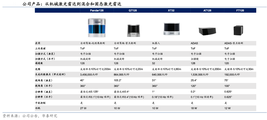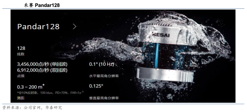 經(jīng)典案例:根據(jù)公司官網(wǎng)、華泰研究等綜合資訊表明,因激光雷達質量對全自動駕駛起到至關重要作用,自動駕駛市場客戶要求激光雷達產(chǎn)品具備車規(guī)級可靠性和堅固性,禾賽的 Pandar 系列和 QT 系列就旨在滿足自動駕駛市場客戶的需求。根據(jù) Frost & Sullivan 的報告,Pandar128 是世界上最先進的機械激光雷達產(chǎn)品之一,提供高水平感知和侵入防護,QT128 則具有 105.2°的寬 垂直視場,是盲區(qū)監(jiān)測最前沿的解決方案之一。