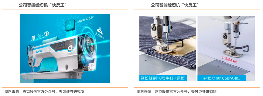 經(jīng)典案例:根據(jù)杰克股份官方公眾號、天風(fēng)證券研究所等綜合資訊表明,杰克股份公司把握“小單快返”機(jī)遇加大研發(fā)投入,于 2023 年 6 月發(fā)布智能縫紉機(jī)新品—“快反王”。公司歷時多年打造,聯(lián)合國內(nèi)外 6 家高校院所和知名機(jī)構(gòu)合作攻關(guān),前后經(jīng)過 150 多萬次的面料測試實(shí)驗(yàn),研發(fā)投入超億元,最終成功研發(fā)出搭載了九腦章魚芯片和大力猿電機(jī)的 A.M.H 面料自適應(yīng)系統(tǒng)。