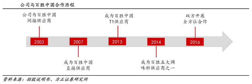 經(jīng)典案例:根據(jù)招股說(shuō)明書(shū)、方正證券研究所等綜合資訊表明,寶立食品公司與百勝中國(guó)合作近 20 年,2016 年以來(lái),雙方已開(kāi)展全方位的合作,公司服務(wù)百勝中國(guó)下屬所有品牌,參與百勝中國(guó)新品開(kāi)發(fā)、菜單設(shè)計(jì)等,產(chǎn)品延伸到腌料、撒粉、調(diào)味醬、沙拉醬、果醬、調(diào)理包、飲品小料和百勝新零售的輕烹食品等多個(gè)品類(lèi)。