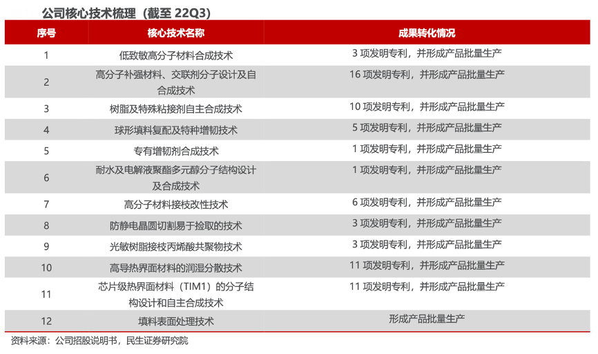 經(jīng)典案例:根據(jù)公司招股說明書、民生證券研究院等綜合資訊表明,德邦科技2022 年研發(fā)費(fèi) 用增長(zhǎng) 52%、達(dá) 4667 萬元,研發(fā)費(fèi)用率為 5.03%,23Q1-Q3 公司研發(fā)費(fèi)用率 為 5.76%。公司擁有形成核心技術(shù)和主營(yíng)業(yè)務(wù)收入有關(guān)的發(fā)明專利 121 項(xiàng)(截至 22Q3),明顯領(lǐng)先同行可比公司。
