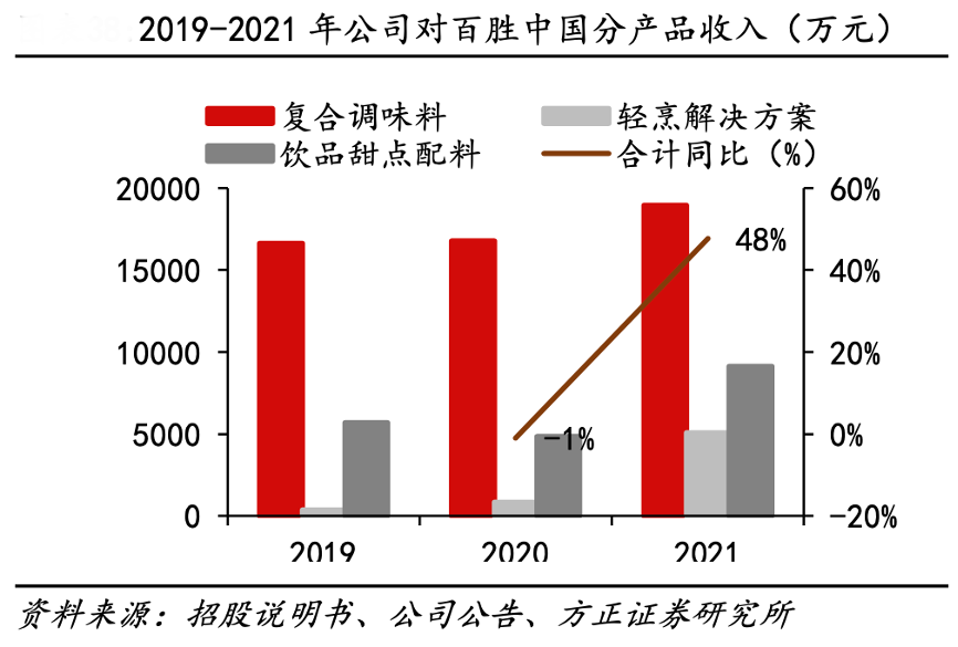 經(jīng)典案例:根據(jù)招股說明書、公司公告、方正證券研究所等綜合資訊表明,寶立食品公司加速推新,持續(xù)不斷為百勝中國提供新品促進(jìn)收入規(guī)模增長,2021年公司對百勝中國的主營業(yè)務(wù)收入較 2020 年大幅增長了 47.71%,三大類產(chǎn)品均有所增長,由于新品占比較大,輕烹解決方案與飲品甜點(diǎn)配料增速更快。