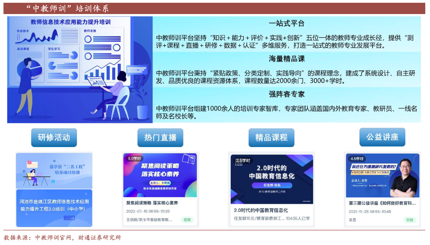 經典案例:根據中教師訓官網、財通證券研究所等綜合資訊表明,中教師訓通過“線上+線 下”混合式培訓與研修活動,精準助力教育管理部門與學校全面提升科學管理水平 及教師專業(yè)能力。截至 2022 年底,“中教師訓”已助力全國 14 個省份及眾多地市、 8 萬多所的一線中小學、幼兒園管理者及教師信息化管理或教學能力提升。
