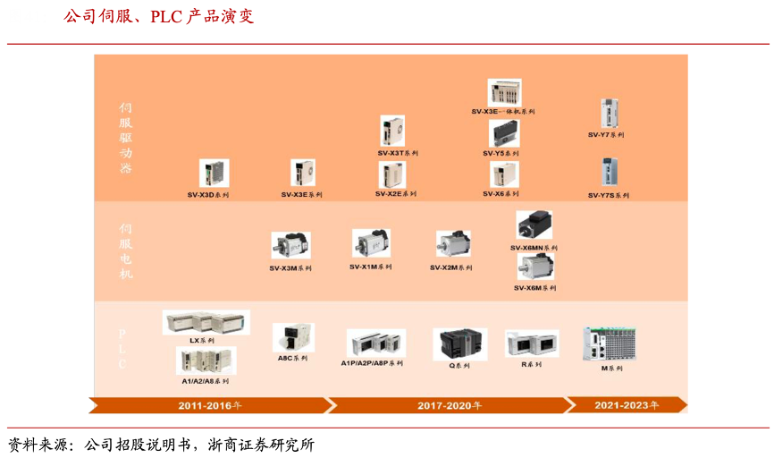 經(jīng)典案例:根據(jù)公司招股說明書、浙商證券研究所等綜合資訊表明,禾川科技公司主力產(chǎn)品每年穩(wěn)步更新迭代,多產(chǎn)品系列滿足不同控制需求。公司 2015 年自主 研發(fā)第一代伺服驅(qū)動器和伺服電機以來,目前已經(jīng)形成 Y 系列 高階伺服、X5 系列進階型伺服、X3E 通用型伺服、X2 E 簡易型伺服、J 系列一體機等伺服 驅(qū)動器,覆蓋客戶差異化需求。