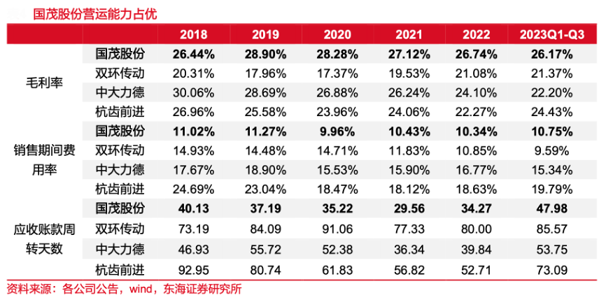 經(jīng)典案例:根據(jù)各公司公告、wind、東海證券研究所等綜合資訊表明,國茂股份公司與主要競(jìng)爭(zhēng)對(duì)手相比,在盈利能力、費(fèi)用管控、收現(xiàn)速度等方面優(yōu)勢(shì)較為明顯。其應(yīng)收賬款周轉(zhuǎn)天數(shù)較低,主要系經(jīng)銷體系較優(yōu),經(jīng)銷商激勵(lì)及分級(jí)管理制度合理,確保應(yīng)收賬款保持高質(zhì)量。