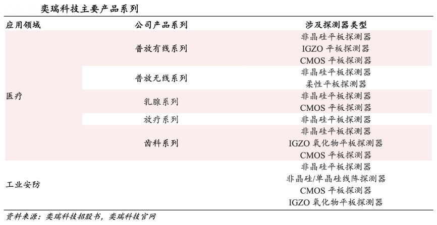 經(jīng)典案例:根據(jù)奕瑞科技招股書、奕瑞科技官網(wǎng)、中銀證券等綜合資訊表明,奕瑞科技公司探測(cè)器涉及醫(yī)療及工業(yè)安防領(lǐng)域,覆蓋靜態(tài)與動(dòng)態(tài)場(chǎng)景需求,通過(guò)不同的探測(cè)器對(duì)于不同產(chǎn)品的場(chǎng)景需求進(jìn)行匹配。其中工業(yè)安防領(lǐng)域產(chǎn)品包括非晶硅/單晶硅線陣探測(cè)器、CMOS 平板探測(cè)器和 IGZO 氧化物平板探測(cè)器。