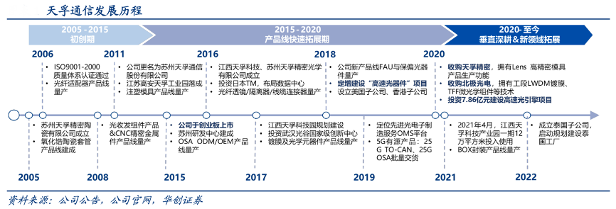 經(jīng)典案例:根據(jù)公司公告、公司官網(wǎng)、華創(chuàng)證券等綜合資訊表明,天孚通信公司是業(yè)界領(lǐng)先的光器件整體解決方案提供商,其在精密陶瓷、工程塑料、復(fù)合金屬、光學(xué)玻璃等基礎(chǔ)材料領(lǐng)域積累沉淀了多項全球領(lǐng)先的核心工藝技術(shù)。經(jīng)過多年發(fā)展,公司已從精密元器件廠商發(fā)展成為擁有多種器件和封裝技術(shù)能力的復(fù)合平臺型企業(yè)。