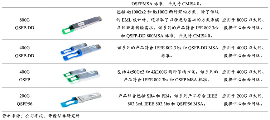 經(jīng)典案例:根據(jù)公司年報(bào)、開(kāi)源證券研究所等綜合資訊表明,蘇州旭創(chuàng)致力于高端光通信收發(fā)模 塊的研發(fā)、設(shè)計(jì)、封裝、測(cè)試和銷(xiāo)售,產(chǎn)品服務(wù)于云計(jì)算數(shù)據(jù)中心、數(shù)據(jù)通信、 5G 無(wú)線網(wǎng)絡(luò)、電信傳輸和固網(wǎng)接入等領(lǐng)域的國(guó)內(nèi)外客戶(hù)。公司注重技術(shù)研發(fā),并推動(dòng) 產(chǎn)品向高速率、小型化、低功耗、低成本方向發(fā)展,為云數(shù)據(jù)中心客戶(hù)提供 100G、 200G、400G 和 800G 的高速光模塊。