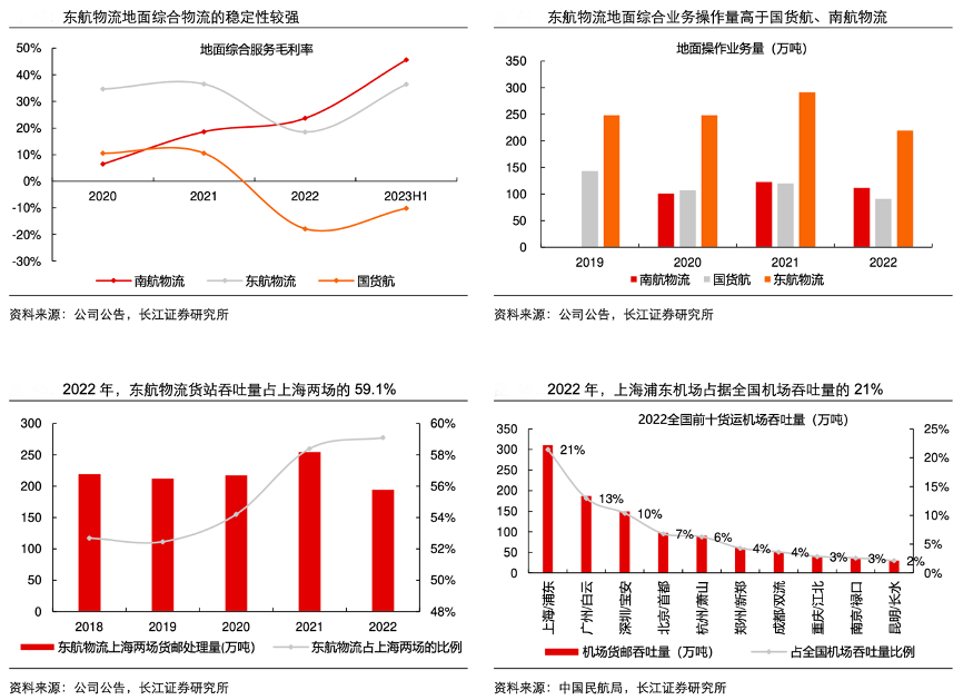 經(jīng)典案例:根據(jù)公司公告、長江證券研究所等綜合資訊表明,東航物流公司從毛利率看,因航空速運、綜合物流解決方案承擔空運干線運輸,利潤跟隨運價波動,盈利周期性較強,2020 年以來,航空速運、綜合物流毛利率維持在較高水平。地面綜合服務(wù)以貨站收入為主,公司卡位布局核心貨站資源,穩(wěn)定賺機場貨量增長的錢,毛利率通常穩(wěn)定維持在 35%以上。