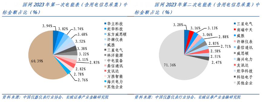 經(jīng)典案例:根據(jù)中國(guó)儀器儀表行業(yè)協(xié)會(huì)、長(zhǎng)城證券產(chǎn)業(yè)金融研究院等綜合資訊表明,近年來,海興電力中標(biāo)率穩(wěn)定,公司在國(guó)網(wǎng)招標(biāo)中,單相智能表和三相智能表中標(biāo)量的市場(chǎng)份額分別維持在3%和5%左右。2023年,國(guó)網(wǎng)第二次電能表(含用電信息采集)中標(biāo)結(jié)果中,海興電力預(yù)中標(biāo)金額為 3.87 億元,市占率為 2.71%,為此次中標(biāo)金額前十名的企業(yè)之一。經(jīng)過多年發(fā)展,公司已經(jīng)穩(wěn)居國(guó)家電網(wǎng)電能表招標(biāo)第一梯隊(duì)。