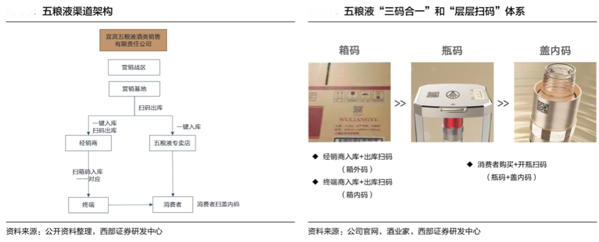 經典案例:2019年6月八代普五上市后,五糧液全面采用掃碼積分系統(tǒng),通過將產品與“箱-瓶-蓋內”三碼綁定,以及“經銷商-終端店-消費 者”層層掃碼,實現了貨流跟蹤監(jiān)控,為實現控盤分利奠定了基礎。