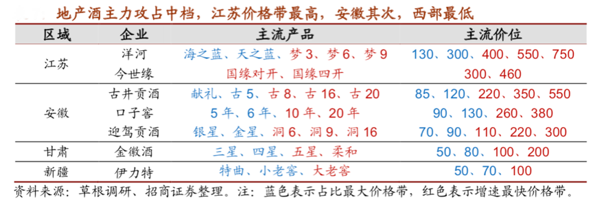 大眾白酒“拉升價格競爭優(yōu)勢”需要因地制宜,結(jié)合區(qū)域經(jīng)濟(jì)發(fā)展、競爭態(tài)勢等綜合研判。據(jù)草根調(diào)研、招商證券等綜合資訊顯示,以地產(chǎn)酒為主力構(gòu)成的“大眾白酒企業(yè)”其因區(qū)域經(jīng)濟(jì)發(fā)展水平不同而占據(jù)不同的“大眾酒價格區(qū)間”,其中江蘇價格帶最高,安徽其次,西部最低。以洋河、今世緣為代表的蘇酒主流價格帶已升級到 300 元以上,以古井、口子窖為代表 的徽酒正在向 200 元以上升級,西部地區(qū)經(jīng)濟(jì)基礎(chǔ)較為薄弱,以金徽酒為代表的甘肅、 伊力特為代表的新疆當(dāng)前由 100 元以下向 100 元以上升級,主流價格帶仍在百元以下。
