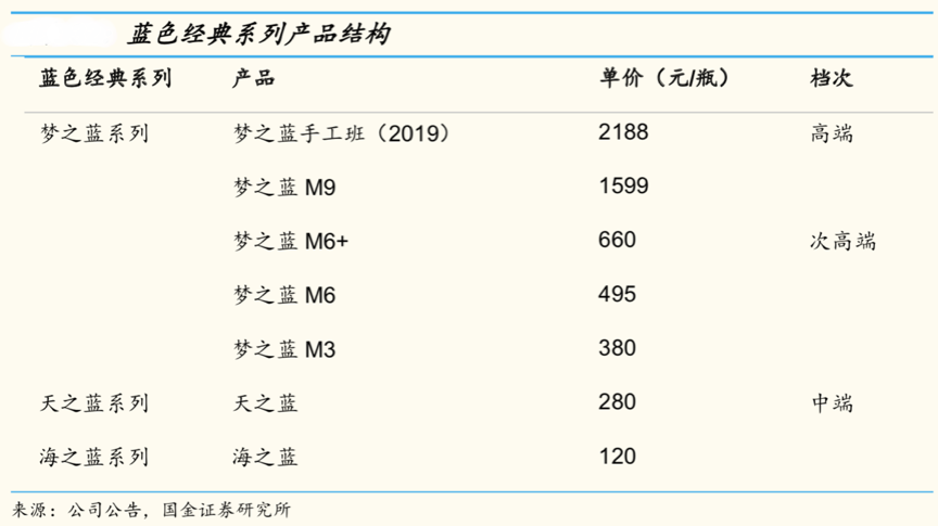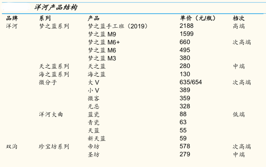 經(jīng)典案例:據(jù)國金證券等公開資訊表明,在產(chǎn)品策略上,洋河由原本的省外主推海天,省內(nèi)主推夢系列轉變?yōu)槭⊥饧哟髩粝盗械耐茝V,實現(xiàn)產(chǎn)品結構升級,省內(nèi)主推夢 6+和夢之藍手工班,以期進一步加強品牌力,打開次高端空間。夢系列在次高端中具有更好的 產(chǎn)品組合優(yōu)勢,中端的基礎產(chǎn)品海之藍與天之藍市場容量大,消費者眾多, 因此相對其他缺乏基礎產(chǎn)品的次高端產(chǎn)品而言,夢之藍具有更強大的品牌 基礎,有望在省外持續(xù)實現(xiàn)較好的增長。