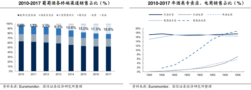 據(jù)行業(yè)公開資料顯示,烈酒、葡萄酒等專賣店份額穩(wěn)定,各品類電商份額穩(wěn)步上升,葡萄酒電商成長(zhǎng)性遠(yuǎn)高于烈酒、啤酒,烈酒電商份額 2017 年超過啤酒;隨著 O2O 的深化,自營(yíng)直供類型的專賣店擴(kuò)張,電商+專賣店的合計(jì)份額還將提升。