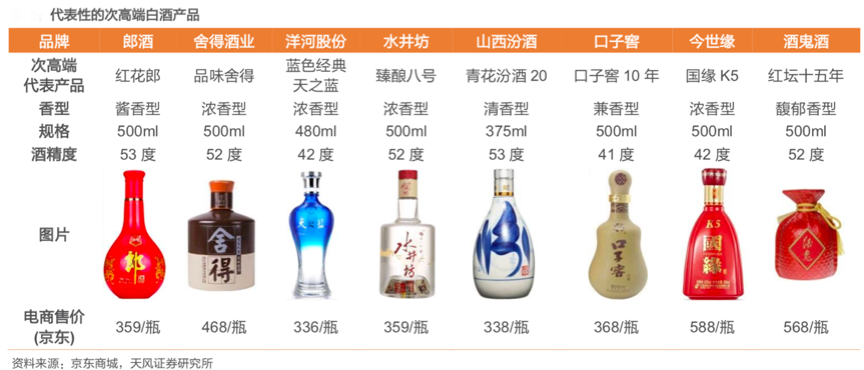 代表性的次高端白酒品牌有舍得、水井坊、酒鬼酒、青花 汾酒、劍南春、郎酒、洋河夢(mèng)之藍(lán)、瀘州老窖窖齡酒等。