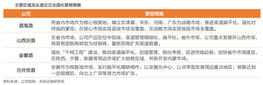 根據(jù)各公司官網(wǎng)、天風(fēng)證券研究所等綜合資訊顯示,各區(qū)域龍頭酒無(wú)不在強(qiáng)化省內(nèi)市場(chǎng)的“根據(jù)地戰(zhàn)略”,聚焦區(qū)域市場(chǎng)精耕的同時(shí),強(qiáng)化外地市場(chǎng)開(kāi)發(fā),創(chuàng)新“區(qū)域廠商關(guān)系”,推進(jìn)精細(xì)化渠道擴(kuò)張,強(qiáng)化重點(diǎn)終端動(dòng)銷(xiāo),以此快速成長(zhǎng),“渠道驅(qū)動(dòng)區(qū)域市場(chǎng)增長(zhǎng)”成為各區(qū)域白酒搶占次高端白酒市場(chǎng)的主流戰(zhàn)略。