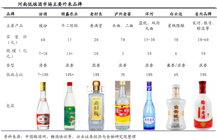 據(jù)中國釀酒網(wǎng)、糖酒快訊、興業(yè)證券等綜合資訊顯示,河南18個地市約88個縣,幾乎縣縣都有自己的酒廠,近一半的低端酒市場由地產(chǎn)白酒占據(jù),如杜康在洛陽占絕對優(yōu) 勢;張弓和宋河在永城有一部分消費群;許昌地區(qū)消費能力有限,鹿邑大曲、賒 店、仰韶等表現(xiàn)較好;雞公山在信陽規(guī)模超過 2 億元等。
