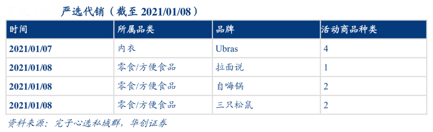 經(jīng)典案例:根據(jù)完子心選私域群、華創(chuàng)證券等綜合資訊表明,完子之家私域發(fā)展“嚴選代銷”模式。逸仙電商通過自行選品(類似網(wǎng)易嚴選),在私域渠道內(nèi)經(jīng)銷非競爭品牌(異業(yè)合作),主要品類集中于零食/方便食品、女性內(nèi)衣等。商 品售賣采用限時活動促銷的方式,在售賣日前 3 天左右開始預熱,且活動時間短至 1 天,短時效性+頻繁推送優(yōu)惠信息刺激用戶下單購買。
