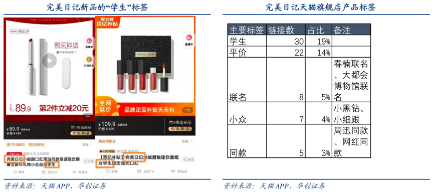 經(jīng)典案例:根據(jù)天貓APP、華創(chuàng)證券等綜合資訊表明,國際大牌化妝品品牌的單價通常 150~400 元之 間,對美妝預算有限的學生黨和想要試錯的美妝小白來說門檻較高。完美日記將學生黨作為種子用戶:在天貓旗艦店等線上渠道,將“學生”納入其搜索關鍵詞/產(chǎn)品名稱,和其捆綁在一起,加深目標消費群體“學生友好”標簽印象。