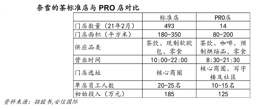 經(jīng)典案例:根據(jù)公司招股書、安信國際等綜合資訊表明,除了在全國快速擴張奈雪的茶標準茶飲店外,奈雪的茶公司從 2020 年 11 月開始推出深入高級寫字樓的“奈雪PRO店”。這是奈雪的新發(fā)展策略,截止 2021 年 2 月 5 日已經(jīng)開設了 14 家門店,預計未來 70%的門店將為奈雪 PRO 店。與 PRO 店與標準店的主要區(qū)別在于: 其移除了現(xiàn)場烘焙區(qū)域,面積更小,人員更精簡。PRO 店仍保持大店模式,面積在 80-200 平米間,但較標準門店更小一些。預制產(chǎn)品由深圳的中央廚房制作,可覆蓋深圳全市。