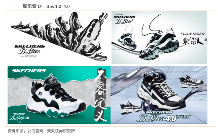 經(jīng)典案例:根據(jù)公司官網(wǎng)、天風(fēng)證券研究所等綜合資訊表明,斯凱奇熊貓鞋從誕生起,就在不斷超越和創(chuàng)新,將“老爹鞋”賦予運動鞋的趣味性和故 事性。從 D‘Lites1.0 到如今 4.0 升級版本,斯凱奇始終悉心洞察年輕人的喜好,用自我顛 覆的創(chuàng)新力展現(xiàn)著“坐不住”的品牌精神。