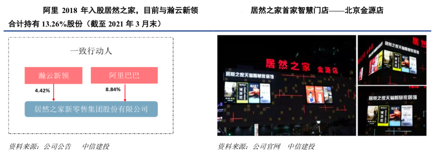 經(jīng)典案例:根據(jù)公司公告、公司官網(wǎng)、中信建投等綜合資訊表明,居然之家 2018 年初開(kāi)始與阿里巴巴達(dá)成深度戰(zhàn)略合作,以大數(shù)據(jù)平臺(tái)建設(shè)為核心,全面推進(jìn)線上線下融合,打造家居新零售新模式。2018 年 2 月 11 日,阿里巴巴以 54.53 億元收購(gòu)居然之家 15%股份,借殼上市后目前阿里持有公司股份 8.84%成為公司第三大股東,借助阿里巴巴強(qiáng)大的大數(shù)據(jù)、云計(jì)算、智能硬件等零售技術(shù)能力,居然之家圍繞賣(mài)場(chǎng)數(shù)字化、線上增量平臺(tái)、門(mén)店存量轉(zhuǎn)化等三方面對(duì)賣(mài)場(chǎng)進(jìn)行持續(xù)改造升級(jí)。