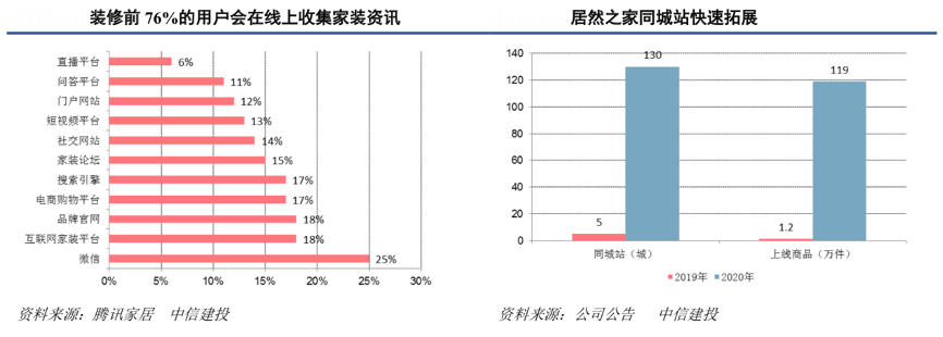 經(jīng)典案例:根據(jù)公司公告、騰訊家居、中信建投等綜合資訊表明,居然之家與阿里巴巴攜手對(duì)天貓平臺(tái)的“居然之家”官方旗艦店進(jìn)行了改造升級(jí),將傳統(tǒng)的電商店鋪升級(jí)為基于本地化特色商品及服務(wù)的“同城站”。2020年居然之家公司加速推動(dòng)同城站建設(shè),以同城站為核心,以直播為前端營(yíng)銷(xiāo)抓手,賦能本地經(jīng)銷(xiāo)商,最終轉(zhuǎn)化線上消費(fèi)轉(zhuǎn)回線下實(shí)體店,實(shí)現(xiàn)線上線下融合。2020 年,公司同城站從 年初的覆蓋 5 城快速增長(zhǎng)至 130 城,上線商品從年初的 1.2 萬(wàn)件增加至 119 萬(wàn)件,全年同城站引導(dǎo)成交 84.5 億 元。