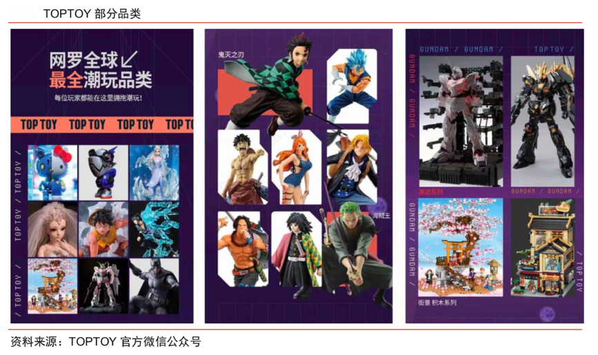 經(jīng)典案例:根據(jù)TOPTOY官方微信公眾號、中信證券研究部等綜合資訊表明,TOPTOY 定位亞洲潮玩集合店,聚焦 10-40 歲男女消費(fèi)群體,商品包括八大大潮玩核心品類:藝術(shù)潮玩、日漫手辦、美漫手辦、盲盒、娃娃模型、拼裝模型、積木、雕塑等。產(chǎn)品價(jià)格跨度大:盲盒價(jià)格多數(shù)在 39~49 元,娃娃模型價(jià)格在 150~250 元不等,蝙蝠俠、滅霸、神奇女俠模型限量款產(chǎn)品價(jià)格高達(dá)幾千元。