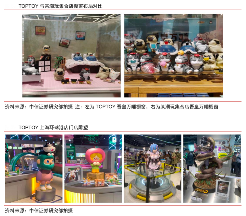 經(jīng)典案例:根據(jù)中信證券研究部等綜合資訊表明,TOPTOY將手辦、盲盒等進(jìn)行開箱展示,搭配道具等進(jìn)行場景化、故事化展現(xiàn),更易打動(dòng)人心。草根調(diào)研發(fā)現(xiàn),場景化、故事化的商品呈現(xiàn)方式,更能激發(fā)購買欲望,非場景化的擺放讓銷售僅停留在商品層面。
