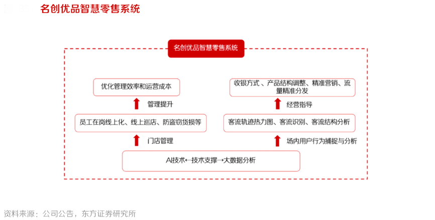經(jīng)典案例:根據(jù)公司公告、東方證券研究所等綜合資訊表明,名創(chuàng)優(yōu)品各個門店基本覆蓋智慧門店系統(tǒng),基于對消費者店內(nèi)消費行為模式以及產(chǎn)品銷售趨勢的分析,決定各門店的產(chǎn)品組合,完成門店之間的合理分配,實現(xiàn)庫存風(fēng)險最小化。根據(jù) FY2020 數(shù)據(jù),國內(nèi)市場方面進店客流量超過 4.16 億人次,約 30%消費者進行購買行為。在用戶畫像方面,80%到店消費者年齡低于 40 歲,60%到店消費者年齡低于 30 歲,20-30 歲人群消費能力最強,符合公司的核心客群定位。