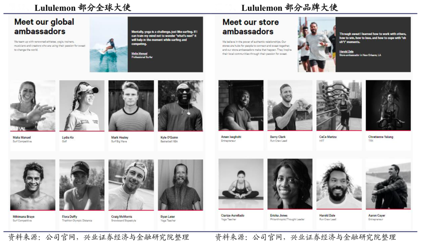 經(jīng)典案例:根據(jù)公司官網(wǎng)、興業(yè)證券經(jīng)濟與金融研究院等綜合資訊表明,相較于簽約體育明星等擁有泛化粉絲群體的傳播方式不同,lululemon 選擇與區(qū)域內(nèi) KOL 合作打造品牌大使成本更低且更高效。截止 2021 年 4 月 19 日,lululemon 全球大使共 42 位,囊括了瑜伽、冥想、游泳、馬拉松、拳擊等領(lǐng)域的杰出運動員。門店大使范圍更寬泛,還包括企業(yè)家、演講者、營養(yǎng)師、 音樂家等各個領(lǐng)域。這其中最重要的品牌大使是瑜伽場館教練,lululemon為品牌 大使提供諸多福利,包括服裝配額、新品試穿、官網(wǎng)等社交媒體宣傳等,lululemon 把每一座瑜伽館,都變成了售賣場。