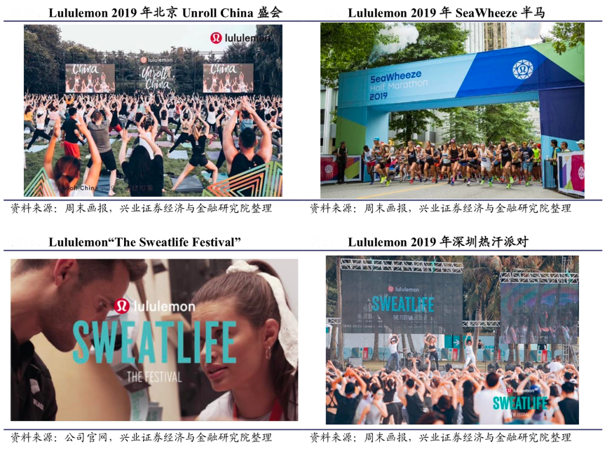 經(jīng)典案例:根據(jù)周末畫報、公司官網(wǎng)、興業(yè)證券經(jīng)濟(jì)與金融研究院等綜合資訊表明,Lululemon 基于店鋪開展社群活動,分店內(nèi)和店外兩種形式。其社群活動會邀請品牌大使進(jìn)行分享,但不局限于品牌大使。 lululemon官方還會定期舉辦大型的戶外活動,形式多樣,運(yùn)動也不局限于瑜伽。 例如傳統(tǒng)的 The Sweatlife Festival。這些活動的目的是為了宣揚(yáng) lululemon 健康運(yùn) 動生活的理念,不以“帶貨”為目的。