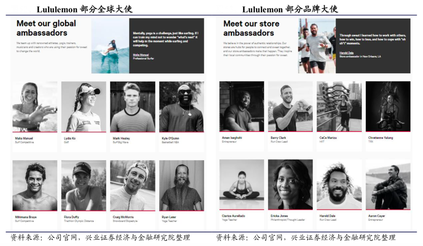 經(jīng)典案例:根據(jù)公司官網(wǎng)、興業(yè)證券經(jīng)濟(jì)與金融研究院等綜合資訊表明,相較于簽約體育明星等擁有泛化粉絲群體的傳播方式不同,lululemon選擇與區(qū)域內(nèi) KOL 合作打造品牌大使成本更低且更高效。Lululemon 品牌大使包括全球大使和門店大使。截止 2021 年 4 月 19 日,lululemon 全球大使共 42 位,囊括了瑜伽、冥想、游泳、馬拉松、拳擊等領(lǐng)域的杰出運(yùn)動員。門店大使范圍更寬泛,還包括企業(yè)家、演講者、營養(yǎng)師、音樂家等各個領(lǐng)域。這其中最重要的品牌大使是瑜伽場館教練,lululemon 為品牌大使提供諸多福利,包括服裝配額、新品試穿、官網(wǎng)等社交媒體宣傳等,lululemon 把每一座瑜伽館,都變成了售賣場。