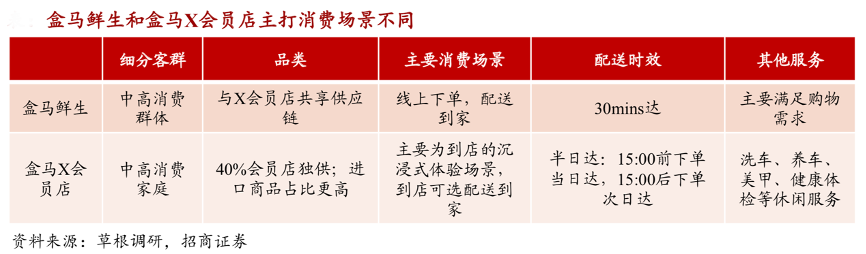 經(jīng)典案例:根據(jù)草根調(diào)研、招商證券等綜合資訊表明,目前盒馬鮮生的線上化率達60%以上,更多是強調(diào)到家,消費者下單能夠享受即時配送。X會員店為消費者提供一個到店的沉浸式的體驗場景,以“逛”的體驗為主,結(jié)合購買家庭所需生鮮、烘焙、零食等同時享受其他休閑服務(wù),感受更有溫度的購物體驗。