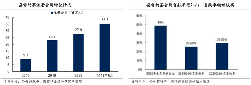 經(jīng)典案例:根據(jù)公司招股說明書、國信證券經(jīng)濟研究所等綜合資訊表明,奈雪的茶公司從 2019 年 9 月推出奈雪的茶會員體系,注冊會員人數(shù)由截至 2019 年底的 9.3 百萬人大幅增至截至 2020 年末的 27.9 百萬人及 2021 年 2 月 5 日的 35.3 百萬人,會員規(guī)??焖贁U大。截至 2020 年奈雪的茶訂單總數(shù)的約 49.0%來 自會員貢獻,顯示其會員認(rèn)可度較高。公司活躍會員人數(shù)由 2019Q4 的 2.0 百 萬人增加至 2020 Q4 的 5.8 百萬人。