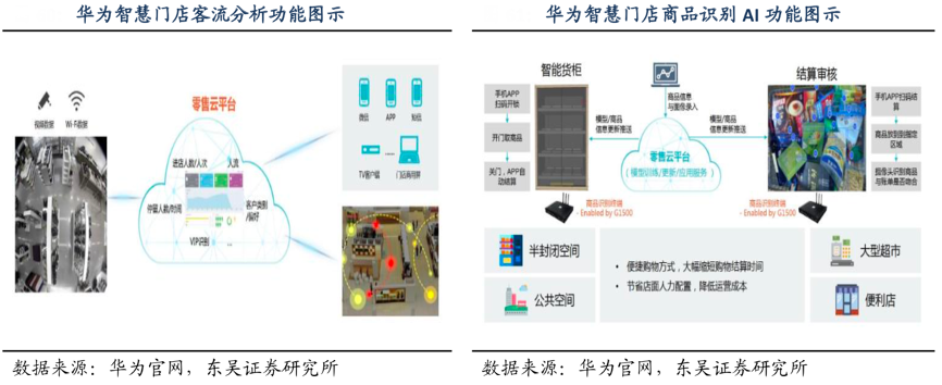 經(jīng)典案例:根據(jù)華為官網(wǎng)、東吳證券研究所等綜合資訊表明,“AI+視頻”扮演重要角色,其通過人臉識別、人形檢測、行為分析、物體識別等技術(shù),伴隨客戶進店、逛店。用戶進店后,零售云平臺捕捉其在店內(nèi)的動線及行為軌跡被智能攝像頭及人臉識別技術(shù)捕捉,錄入后臺數(shù)據(jù)庫并分析用戶偏好、停留熱區(qū), 從而進行后續(xù)精準(zhǔn)營銷、店面布局優(yōu)化。在逛店環(huán)節(jié),可通過智能手推車、智能貨柜、 刷臉識別等方式簡化結(jié)賬流程,提升坪效。