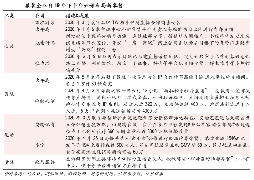 經(jīng)典案例:根據(jù)達(dá)人記、搜狐財(cái)經(jīng)、新浪財(cái)經(jīng)、網(wǎng)易新聞網(wǎng)、億邦動(dòng)力網(wǎng)、中銀證券等綜合資訊表明,紡織服裝龍頭品牌近年來(lái)大力布局線上渠道,積極開(kāi)拓電商業(yè)務(wù),探索新零售渠道。例如森馬服飾簽約淘寶頭部主播陳潔Kiki 作為直播合伙人,積極開(kāi)展童裝等領(lǐng)域的帶貨;太平鳥(niǎo)通過(guò)微信線上會(huì)員專場(chǎng)、小程序分銷、直播等創(chuàng)新場(chǎng)景打通與消費(fèi)者的連接,利用大數(shù)據(jù)進(jìn)行多維度精準(zhǔn)營(yíng)銷。