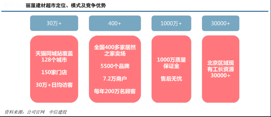 經(jīng)典案例:根據(jù)公司官網(wǎng)、中信建投等綜合資訊表明,麗屋輔材超市對標全球最大的建材零售商家得寶(Home-Depot),為了給家裝工長提供高品質(zhì)、多元化的主材及輔材選擇,同時賦能行業(yè)中的主材、輔材商,麗屋輔材+裝修基材輔料采購平臺將采取 B2B2C 和 B2C 相結(jié)合的運營模式,一方面從供應(yīng)端加大 IP 自有品牌業(yè)務(wù)的開發(fā),提升裝修基材和輔材的品質(zhì);另一方面免費為 B 端施工隊和 C 端客戶提供配送服務(wù),解決行業(yè)痛點。2020 年 5 月輔材+APP 已實現(xiàn)上線并開始推廣使用,實現(xiàn)了工長線上訂貨、線下配送的服務(wù)模式。預(yù)計 2021~2022 年,麗屋輔材+將完成 APP 建設(shè),供應(yīng)鏈整合深耕北京市場。