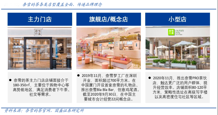 經(jīng)典案例:根據(jù)奈雪的茶官網(wǎng)、國(guó)盛證券研究所等綜合資訊表明,奈雪旗艦店包括奈雪夢(mèng)工廠、奈雪的禮物店以及奈雪 Bla Bla Bar,向消費(fèi)者傳遞多元化體驗(yàn)。1)2019 年 11 月,奈雪夢(mèng)工廠在深圳開業(yè),打造多場(chǎng)景大型體驗(yàn)茶飲店,面積 超過 700 平方米。2)2019 年公司在中國(guó)廈門開設(shè)首家奈雪的禮物店,將城市獨(dú)有的文 化融入空間,重金打造具有城市風(fēng)格的禮物店。3)奈雪 Bla Bla Bar 菜單包含一系列創(chuàng) 意雞尾酒,實(shí)現(xiàn)社交場(chǎng)景的“1+1”。白天在奈雪享受一杯好茶,一口軟歐包帶來的美好 生活,晚上在奈雪 Bar 享受夜生活。截至 2020 年,在中國(guó)主要城市合計(jì)經(jīng)營(yíng) 20 間奈雪 Bla Bla Bar。