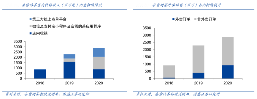經(jīng)典案例:根據(jù)奈雪的茶招股說明書、國(guó)盛證券研究所等綜合資訊表明,受到疫情影響及公司持續(xù)布局小程序等點(diǎn)單渠道,2020 年,奈雪的茶公司微信及支付寶小程序銷售收入占比為 41.2%,占比持續(xù)攀升,店內(nèi)收銀占比為 30.4%,第三方線上點(diǎn)單平臺(tái)銷售收入占比為 41.2%(包括自提訂單)。2018-2020 年,奈雪門店外賣訂單銷售收入占比 由 7.5%逐步攀升至 31.9%。公司數(shù)字化發(fā)展下,信息系統(tǒng)能夠整合線上及線下交易信息,積累消費(fèi)者數(shù)據(jù),利用多渠道數(shù)據(jù)來針對(duì)性進(jìn)行產(chǎn)品設(shè)計(jì)、營(yíng)銷推廣。