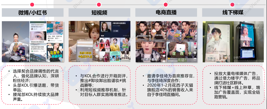 經(jīng)典案例:根據(jù)《藍色光標-化妝品行業(yè):新國貨彩妝洞察》、公司官網(wǎng)等綜合資訊表明,花西子依據(jù)不同渠道的基因以及用戶屬性不同,定制化內容種草,從明星、KOL種草、短視頻全方位內容營銷助力品牌影響力,同時與頭部主播李佳琦進行密切合作,搭上電商直播的首班車。