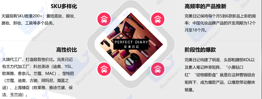 經(jīng)典案例:根據(jù)《藍色光標-化妝品行業(yè):新國貨彩妝洞察》、公司官網(wǎng)等綜合資訊表明,完美日記自2017年成立以來,一直走在國貨彩妝的最前端,主打高性價比、大牌平替的新時尚美妝潮流;同時以高頻次的產(chǎn)品更新以及階段性的爆款單品,不斷刷新品牌認知和時尚潮流的品牌形象,帶動影響力和消費市場