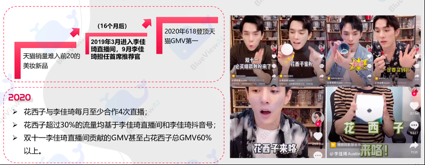 經(jīng)典案例:根據(jù)《藍色光標-化妝品行業(yè):新國貨彩妝洞察》、公司官網(wǎng)等綜合資訊表明,KOL選擇上,花西子慧眼識佳琦搭上直播首班快車,長期深度合作持續(xù)引流,李佳琦作為花西子主要的曝光點,不僅是花西子 的最大流量源,也是花西子最大的銷量源;在李佳琦直播間,能夠看出花西子與其達成的深度合作意向。