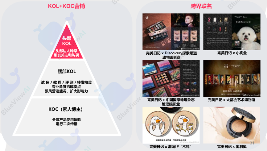 經(jīng)典案例:根據(jù)《藍色光標-化妝品行業(yè):新國貨彩妝洞察》、公司官網(wǎng)等綜合資訊表明,在公域流量方面,完美日記通過明星合作、KOL+KOC營銷、跨界聯(lián)名進行曝光、種草,獲客和銷售; 完美日記借勢明星合作為品牌造勢引流, 通過KOL和KOC聯(lián)動吸引關(guān)注同時提升消費者體驗以及產(chǎn)品口碑,同時推出聯(lián)名產(chǎn)品,不斷給品牌賦能,為完美日記打造“完美鏈路”。